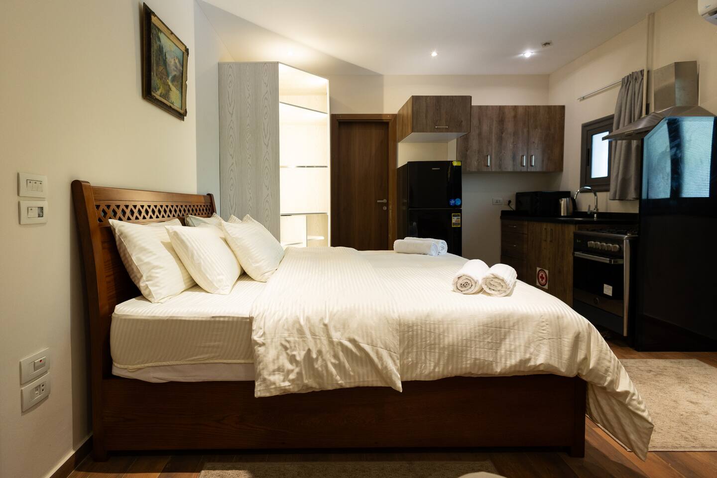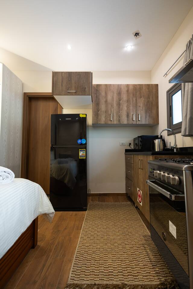 Stay in the heart of historic downtown Cairo, just minutes from the Egyptian Museum, Tahrir Square, Nile River, and Citadel. This stylish studio offers more comfort and amenities than most hotel rooms—at a fraction of the price. Relax in a plush queen-sized bed and enjoy the convenience of watching TV without leaving your pillow. A folded cot is available in the room in case you need extra sleeping room, making the space perfect for couples, small families, quick business trips, or solo travelers. The powerful AC keeps you cool after a day of exploring, while the modern bathroom offers a refreshing shower, hair dryer, and fresh towels. The well-equipped kitchenette includes everything you need to prepare meals or snacks—microwave, kettle, stove/range, oven, and fridge. You’ll also have the convenience of in-unit laundry, so you can pack light and stay fresh throughout your trip. Whether you’re here for sightseeing, work, or simply soaking in Cairo’s rich history, you’ll love the unbeatable location, thoughtful touches, and welcoming atmosphere of this apartment. From cultural landmarks to local dining, everything is just steps away. Make this charming studio your home base in Cairo and experience the city like a local—comfortably, conveniently, and affordably.
