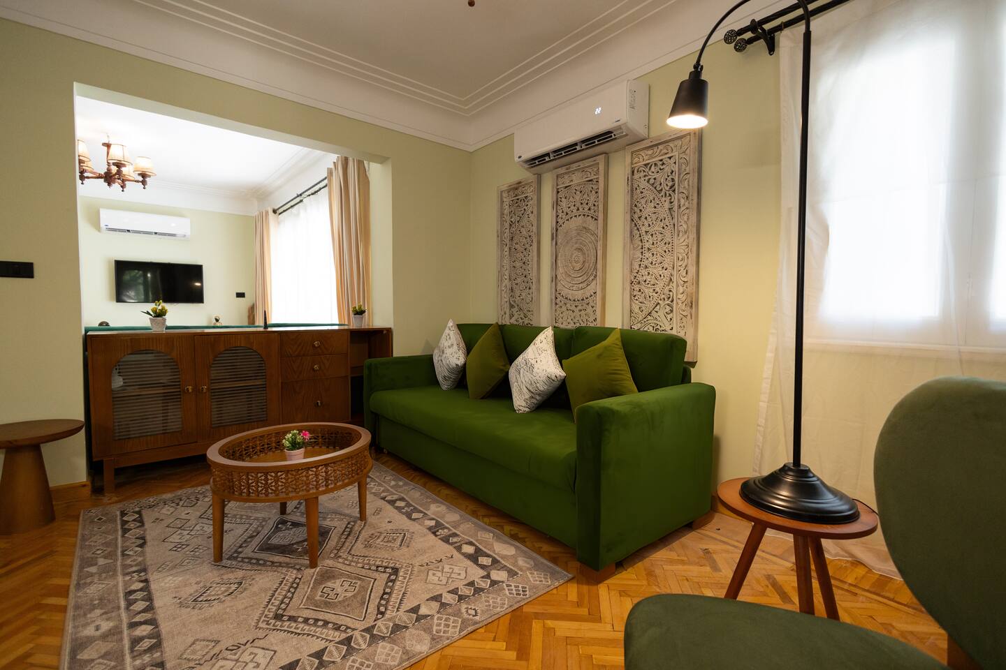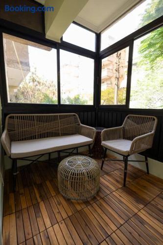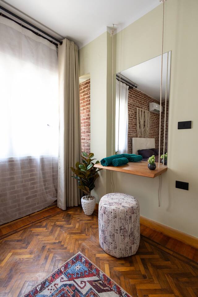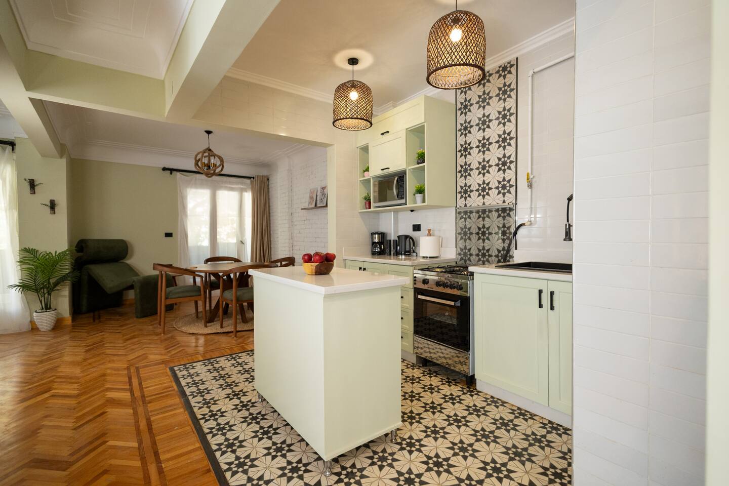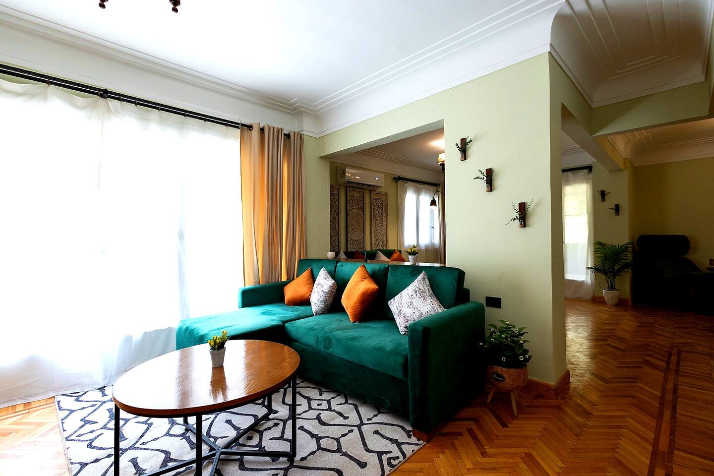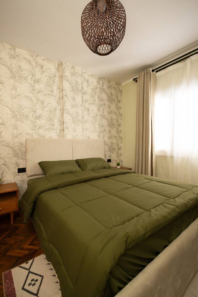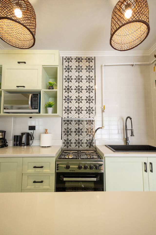 Step into a world of elegance and comfort as you enter our newly renovated apartment, completed in August 2024. The moment you walk through the door, you'll be greeted by the warm glow of natural light reflecting off the vintage herringbone floors that stretch throughout the space. Each piece of furniture was designed specifically for the space by local artists, selected to provide both style and functionality. Fully air-conditioned in all spaces, the apartment ensures a cool and comfortable stay, no matter the season. The apartment features two beautifully designed bedrooms, each offering a peaceful haven with comfortable beds and tasteful decor. Whether you're winding down after a day of exploring Cairo or simply enjoying a quiet moment, these rooms promise a restful night's sleep. The living area boasts two additional sofa beds, allowing the space to accommodate up to eight guests comfortably. One of the highlights of this apartment is its balconies, providing ample outdoor space to relax and soak in the vibrant energy of Heliopolis. Imagine starting your day with a cup of coffee on the large covered patio, listening to the birds sing as the city awakens. In the evening, the balconies offer the perfect setting for unwinding with a book or sharing a meal with loved ones under the stars. The open-concept kitchen and dining area are designed for both cooking and entertaining. Modern appliances and sleek countertops make meal preparation a joy, while the dining area invites you to gather around for memorable meals and conversations. The seamless flow between these spaces ensures that everyone can stay connected, whether you're cooking, dining, or lounging in the living area. Situated in the heart of Heliopolis, this apartment is more than just a place to stay – it's your gateway to experiencing the best of Cairo. With the airport just a short drive away and the neighborhood's tree-lined streets offering a serene backdrop, you'll find both convenience and tranquility at your doorstep. Stay with us and let our Heliopolis apartment be your stylish sanctuary, where every detail is designed to make you feel at home and create lasting memories.