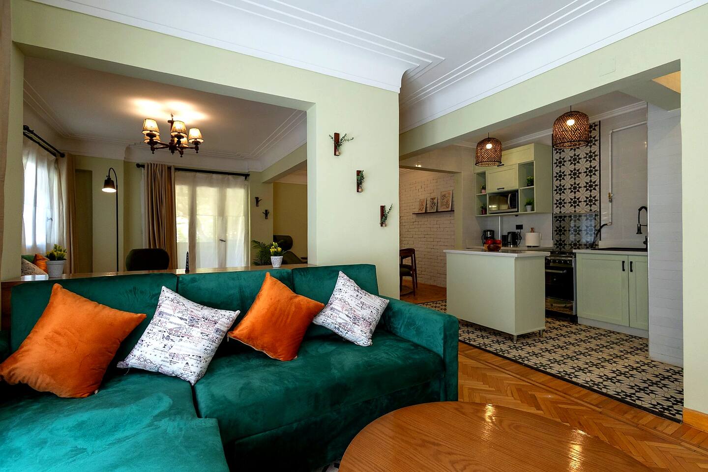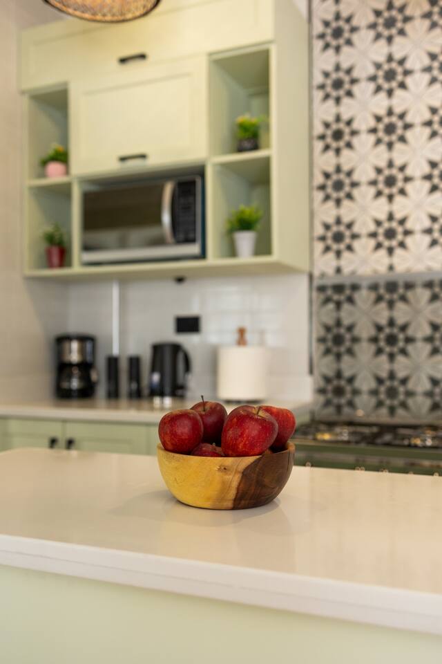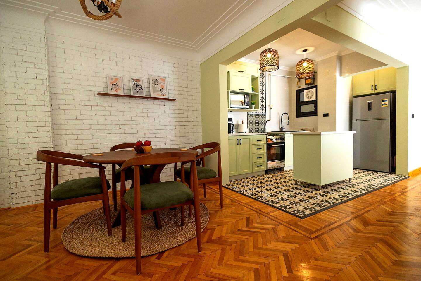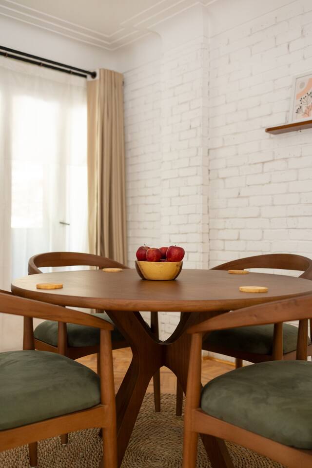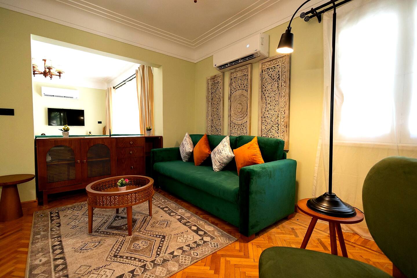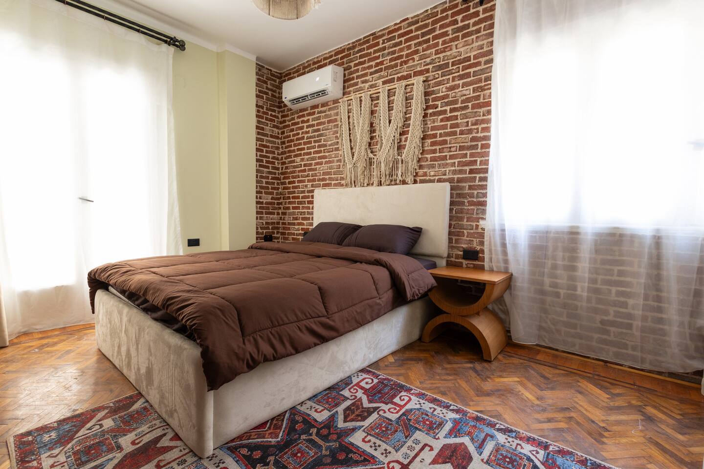 Step into a world of elegance and comfort as you enter our newly renovated apartment, completed in August 2024. The moment you walk through the door, you'll be greeted by the warm glow of natural light reflecting off the vintage herringbone floors that stretch throughout the space. Each piece of furniture was designed specifically for the space by local artists, selected to provide both style and functionality. Fully air-conditioned in all spaces, the apartment ensures a cool and comfortable stay, no matter the season. The apartment features two beautifully designed bedrooms, each offering a peaceful haven with comfortable beds and tasteful decor. Whether you're winding down after a day of exploring Cairo or simply enjoying a quiet moment, these rooms promise a restful night's sleep. The living area boasts two additional sofa beds, allowing the space to accommodate up to eight guests comfortably. One of the highlights of this apartment is its balconies, providing ample outdoor space to relax and soak in the vibrant energy of Heliopolis. Imagine starting your day with a cup of coffee on the large covered patio, listening to the birds sing as the city awakens. In the evening, the balconies offer the perfect setting for unwinding with a book or sharing a meal with loved ones under the stars. The open-concept kitchen and dining area are designed for both cooking and entertaining. Modern appliances and sleek countertops make meal preparation a joy, while the dining area invites you to gather around for memorable meals and conversations. The seamless flow between these spaces ensures that everyone can stay connected, whether you're cooking, dining, or lounging in the living area. Situated in the heart of Heliopolis, this apartment is more than just a place to stay – it's your gateway to experiencing the best of Cairo. With the airport just a short drive away and the neighborhood's tree-lined streets offering a serene backdrop, you'll find both convenience and tranquility at your doorstep. Stay with us and let our Heliopolis apartment be your stylish sanctuary, where every detail is designed to make you feel at home and create lasting memories.