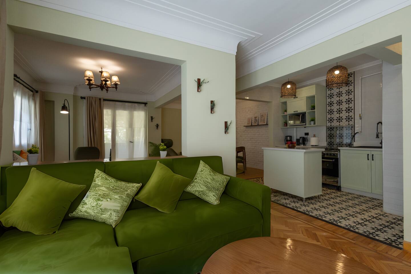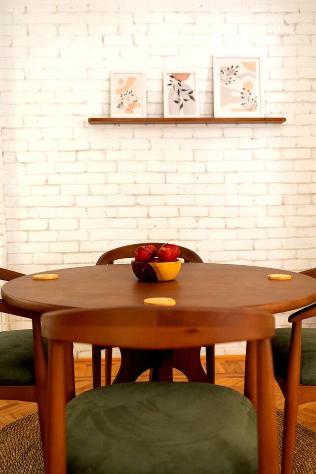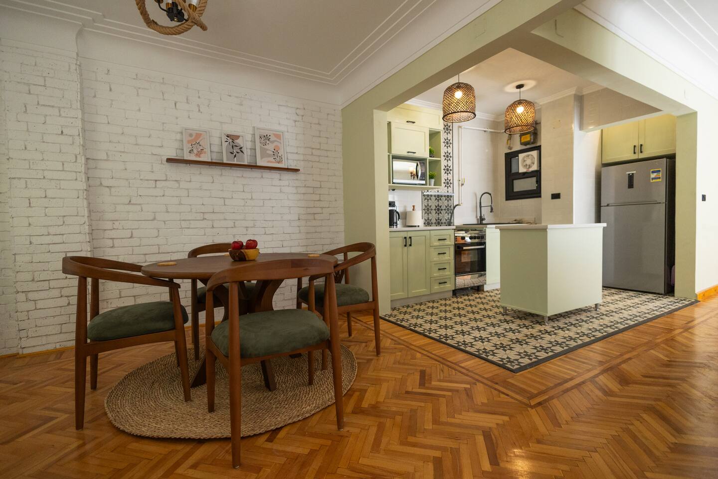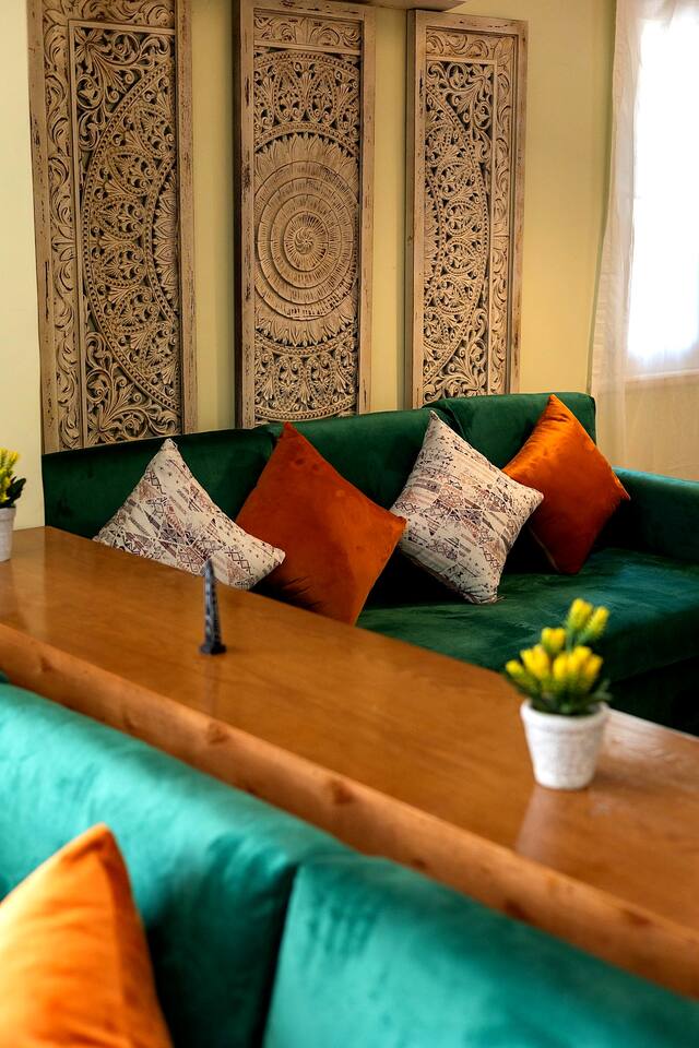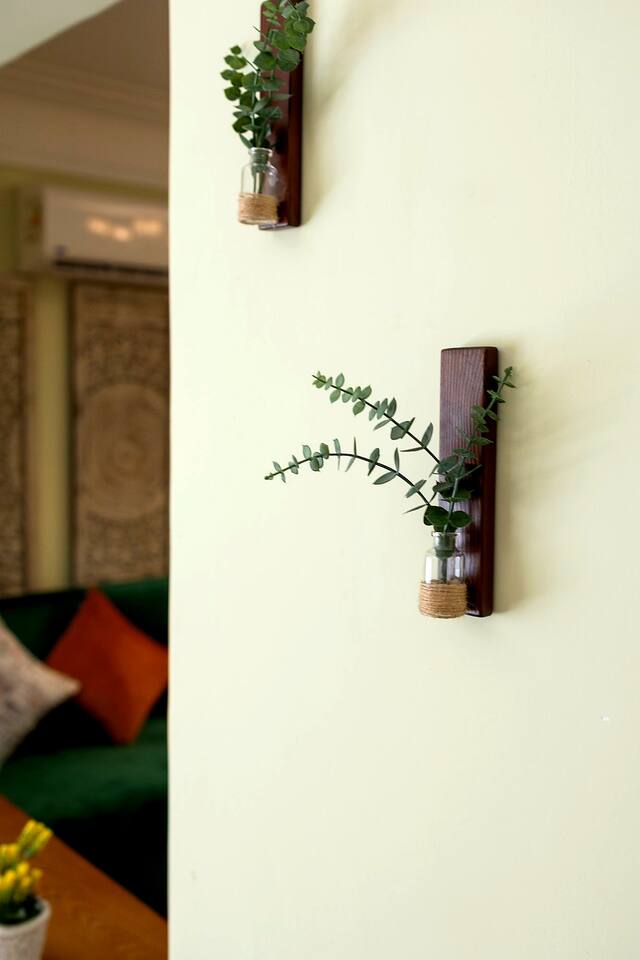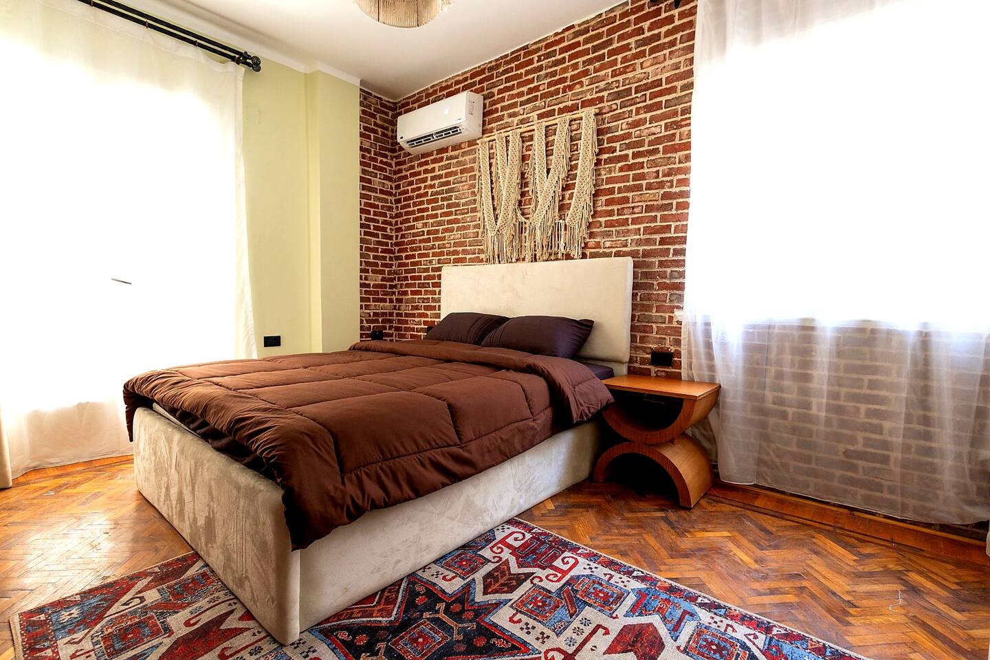 Step into a world of elegance and comfort as you enter our newly renovated apartment, completed in August 2024. The moment you walk through the door, you'll be greeted by the warm glow of natural light reflecting off the vintage herringbone floors that stretch throughout the space. Each piece of furniture was designed specifically for the space by local artists, selected to provide both style and functionality. Fully air-conditioned in all spaces, the apartment ensures a cool and comfortable stay, no matter the season. The apartment features two beautifully designed bedrooms, each offering a peaceful haven with comfortable beds and tasteful decor. Whether you're winding down after a day of exploring Cairo or simply enjoying a quiet moment, these rooms promise a restful night's sleep. The living area boasts two additional sofa beds, allowing the space to accommodate up to eight guests comfortably. One of the highlights of this apartment is its balconies, providing ample outdoor space to relax and soak in the vibrant energy of Heliopolis. Imagine starting your day with a cup of coffee on the large covered patio, listening to the birds sing as the city awakens. In the evening, the balconies offer the perfect setting for unwinding with a book or sharing a meal with loved ones under the stars. The open-concept kitchen and dining area are designed for both cooking and entertaining. Modern appliances and sleek countertops make meal preparation a joy, while the dining area invites you to gather around for memorable meals and conversations. The seamless flow between these spaces ensures that everyone can stay connected, whether you're cooking, dining, or lounging in the living area. Situated in the heart of Heliopolis, this apartment is more than just a place to stay – it's your gateway to experiencing the best of Cairo. With the airport just a short drive away and the neighborhood's tree-lined streets offering a serene backdrop, you'll find both convenience and tranquility at your doorstep. Stay with us and let our Heliopolis apartment be your stylish sanctuary, where every detail is designed to make you feel at home and create lasting memories.