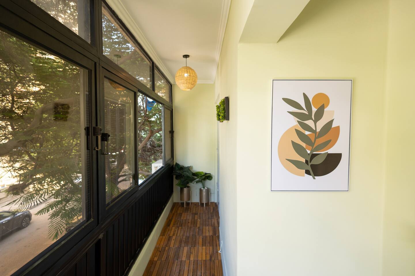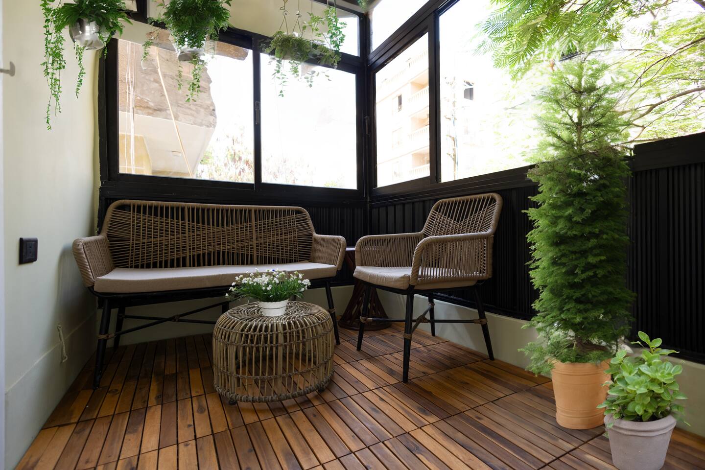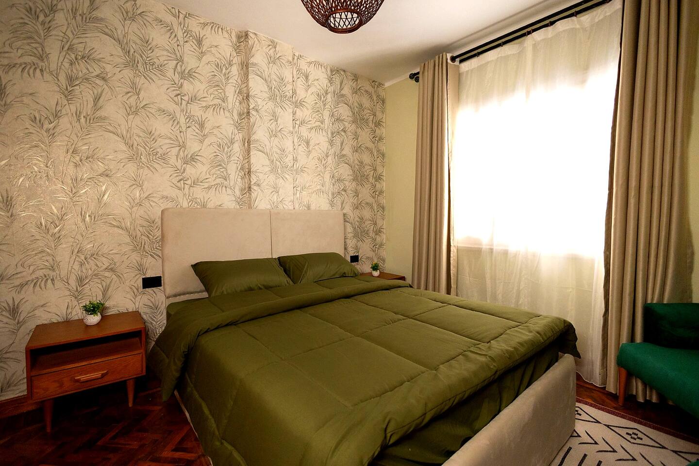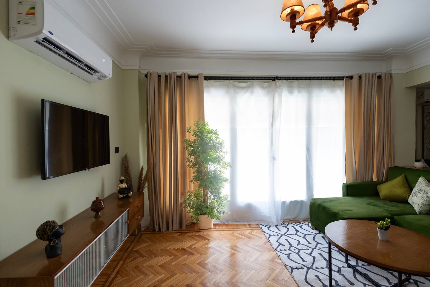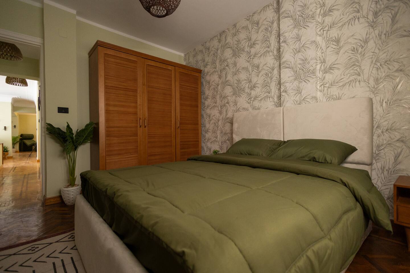 Step into a world of elegance and comfort as you enter our newly renovated apartment, completed in August 2024. The moment you walk through the door, you'll be greeted by the warm glow of natural light reflecting off the vintage herringbone floors that stretch throughout the space. Each piece of furniture was designed specifically for the space by local artists, selected to provide both style and functionality. Fully air-conditioned in all spaces, the apartment ensures a cool and comfortable stay, no matter the season. The apartment features two beautifully designed bedrooms, each offering a peaceful haven with comfortable beds and tasteful decor. Whether you're winding down after a day of exploring Cairo or simply enjoying a quiet moment, these rooms promise a restful night's sleep. The living area boasts two additional sofa beds, allowing the space to accommodate up to eight guests comfortably. One of the highlights of this apartment is its balconies, providing ample outdoor space to relax and soak in the vibrant energy of Heliopolis. Imagine starting your day with a cup of coffee on the large covered patio, listening to the birds sing as the city awakens. In the evening, the balconies offer the perfect setting for unwinding with a book or sharing a meal with loved ones under the stars. The open-concept kitchen and dining area are designed for both cooking and entertaining. Modern appliances and sleek countertops make meal preparation a joy, while the dining area invites you to gather around for memorable meals and conversations. The seamless flow between these spaces ensures that everyone can stay connected, whether you're cooking, dining, or lounging in the living area. Situated in the heart of Heliopolis, this apartment is more than just a place to stay – it's your gateway to experiencing the best of Cairo. With the airport just a short drive away and the neighborhood's tree-lined streets offering a serene backdrop, you'll find both convenience and tranquility at your doorstep. Stay with us and let our Heliopolis apartment be your stylish sanctuary, where every detail is designed to make you feel at home and create lasting memories.