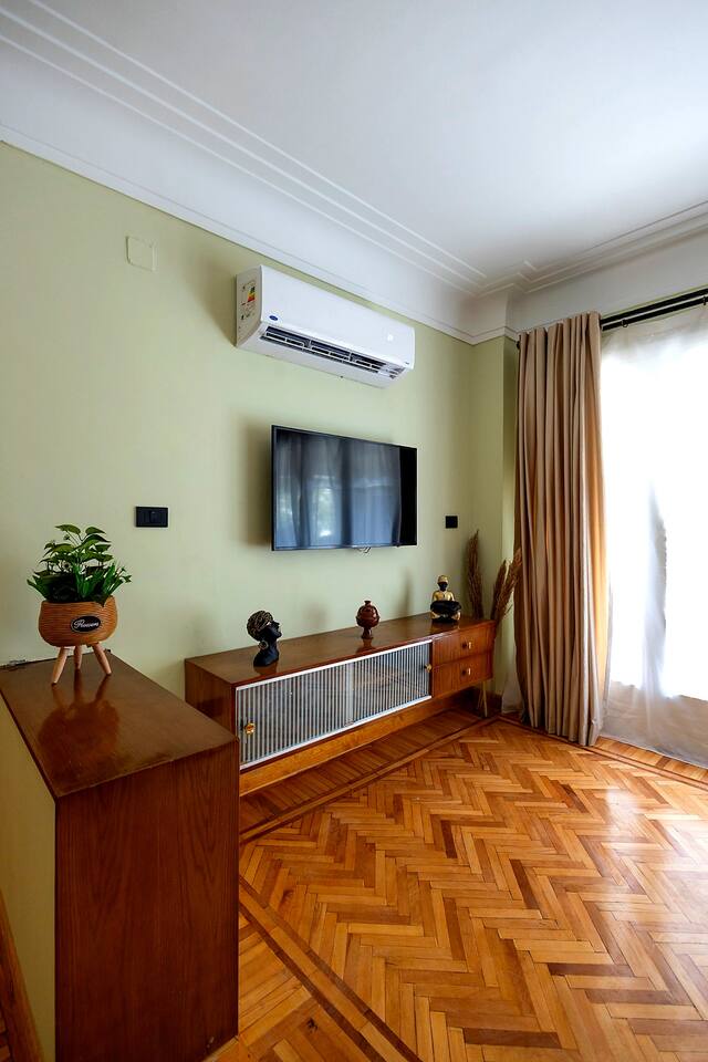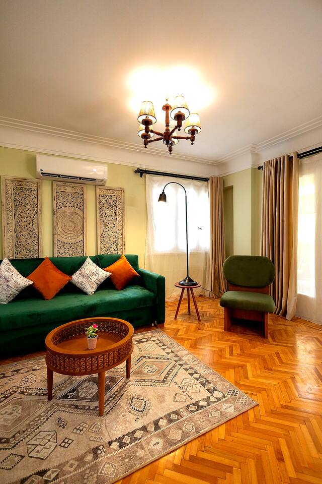 *Fully renovated* Discover the perfect blend of modern luxury & vintage charm in our newly renovated 2-bedroom apartment, nestled in the heart of Heliopolis. This stylish sanctuary, located on a peaceful, tree-lined street, is just minutes from Cairo International Airport, making it an ideal retreat for travelers seeking comfort and convenience. With its thoughtfully curated décor, spacious balconies, and open-concept living area, this apartment offers a dreamy escape in Cairo.