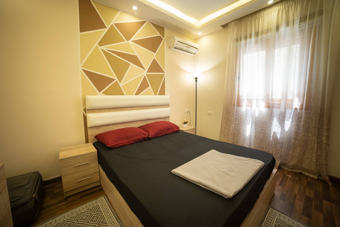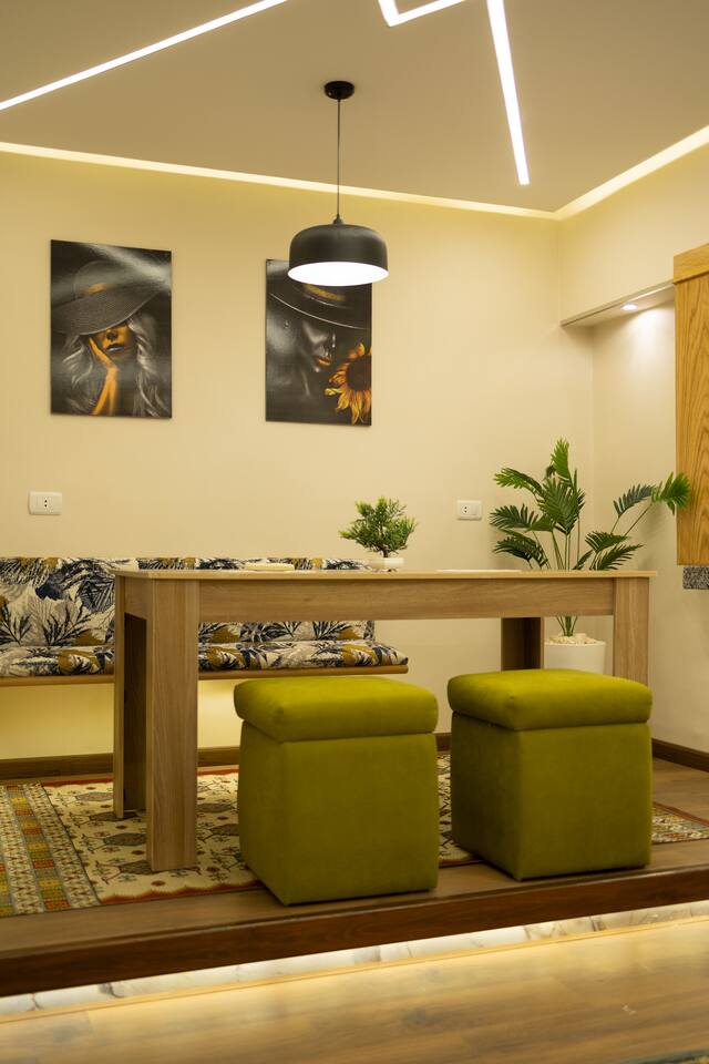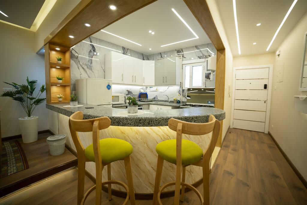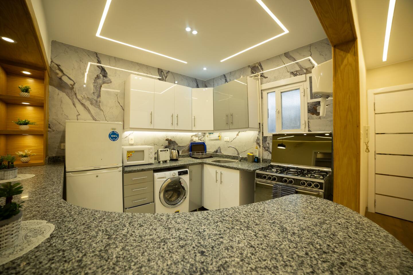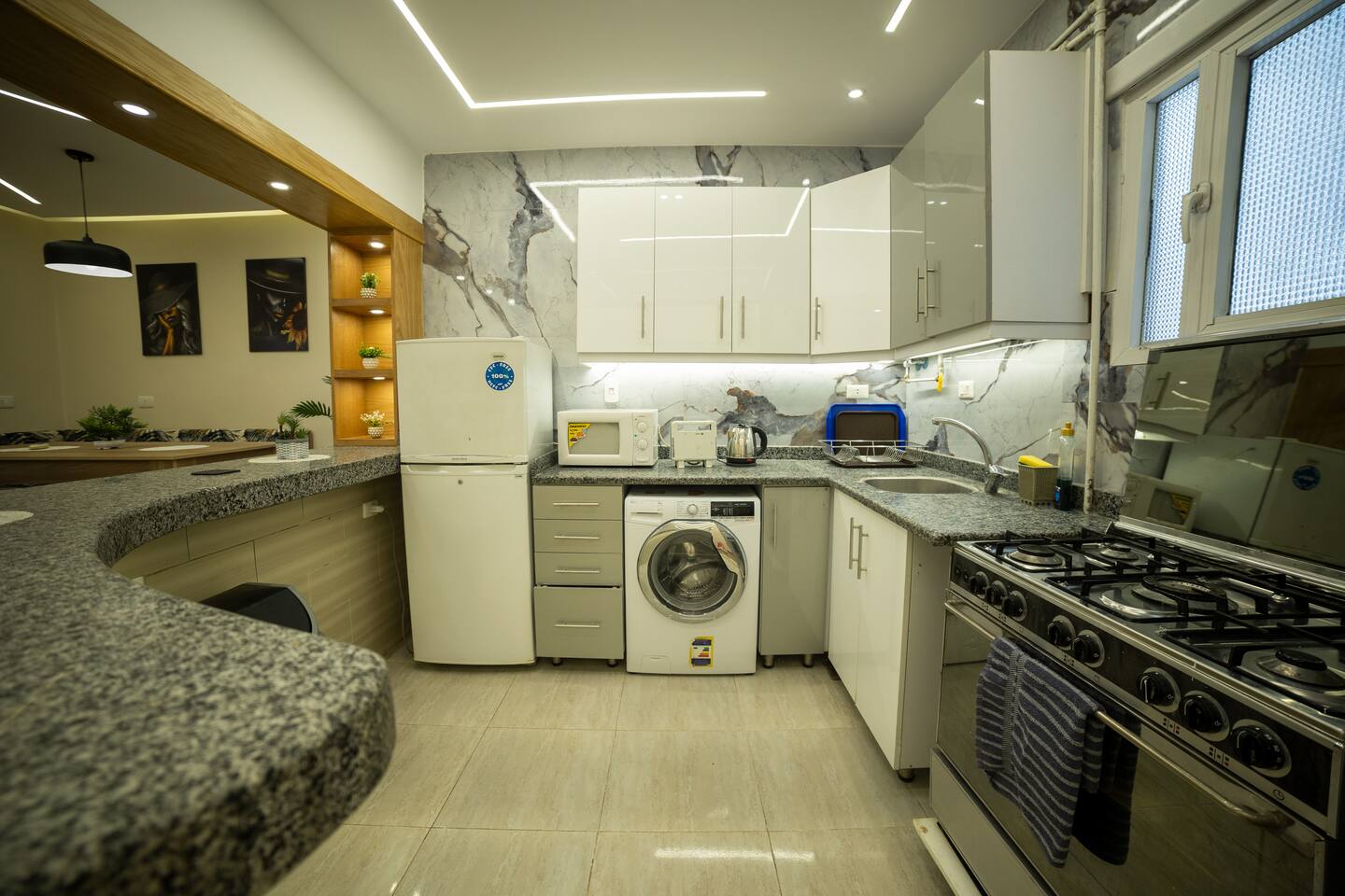 This two-bedroom apartment was recently remodeled to bring you all the modern comforts while traveling in an ancient city. Each bedroom can sleep up to two people: one with two twin beds and another master suite with a queen-sized bed. Each bedroom also comes equipped with a vanity/desk, wardrobe to hang your clothing, and powerful air conditioning to keep cool during hot Egyptian summers. Enjoy comforting fixtures in the bathroom, such as the dramatic marble from the local quarry and large rain showerhead. A full-length mirror in the hall will help you make sure you're looking your best everyday! The living room boasts a large sectional and flatscreen TV. A door leads to a generously-sized terrace balcony overlooking a serene street. It's perfect for hosting and entertaining. To accommodate even more guests, the couch can act as a sofa bed! Host up to six people in total. A full kitchen with bar seating overlooks a dining area/breakfast nook. If you find yourself in the mood to cook, there is a stove, microwave, refrigerator and freezer, electric kettle, and other basic accouterments. It even has an in-unit laundry machine; pack light and throw your clothes in for a refreshing clean! You won't regret booking with us. It’s made for someone who wants a piece of mind or traveling in a small group.