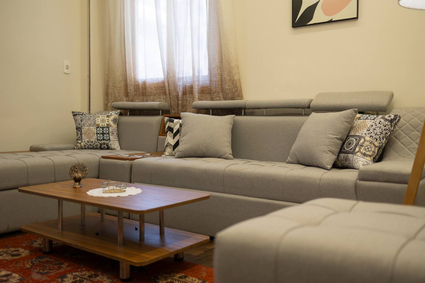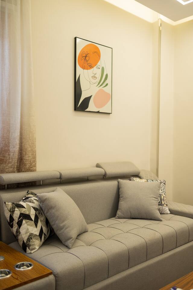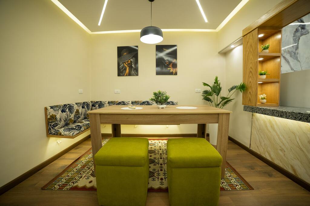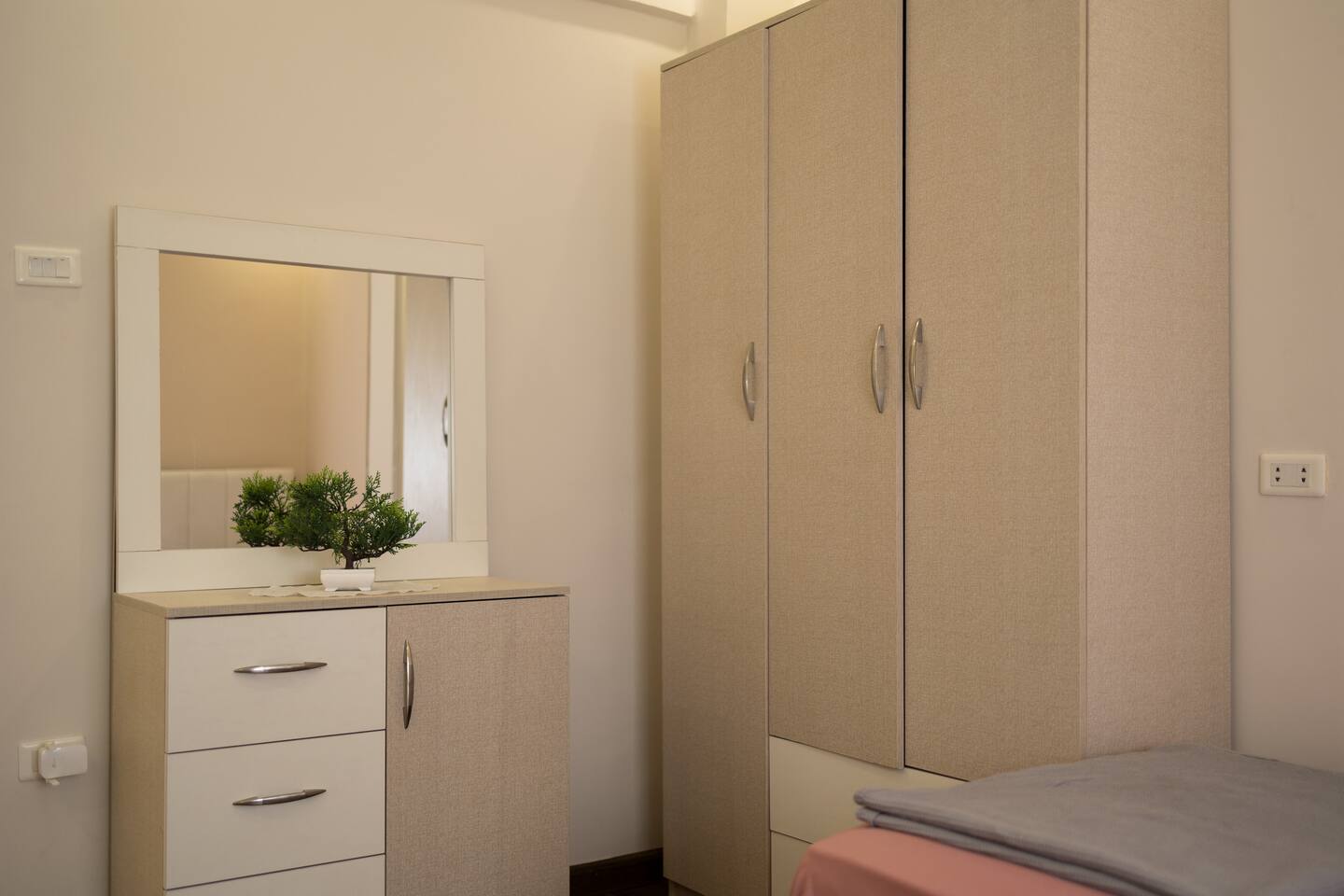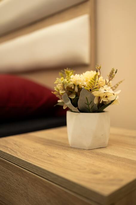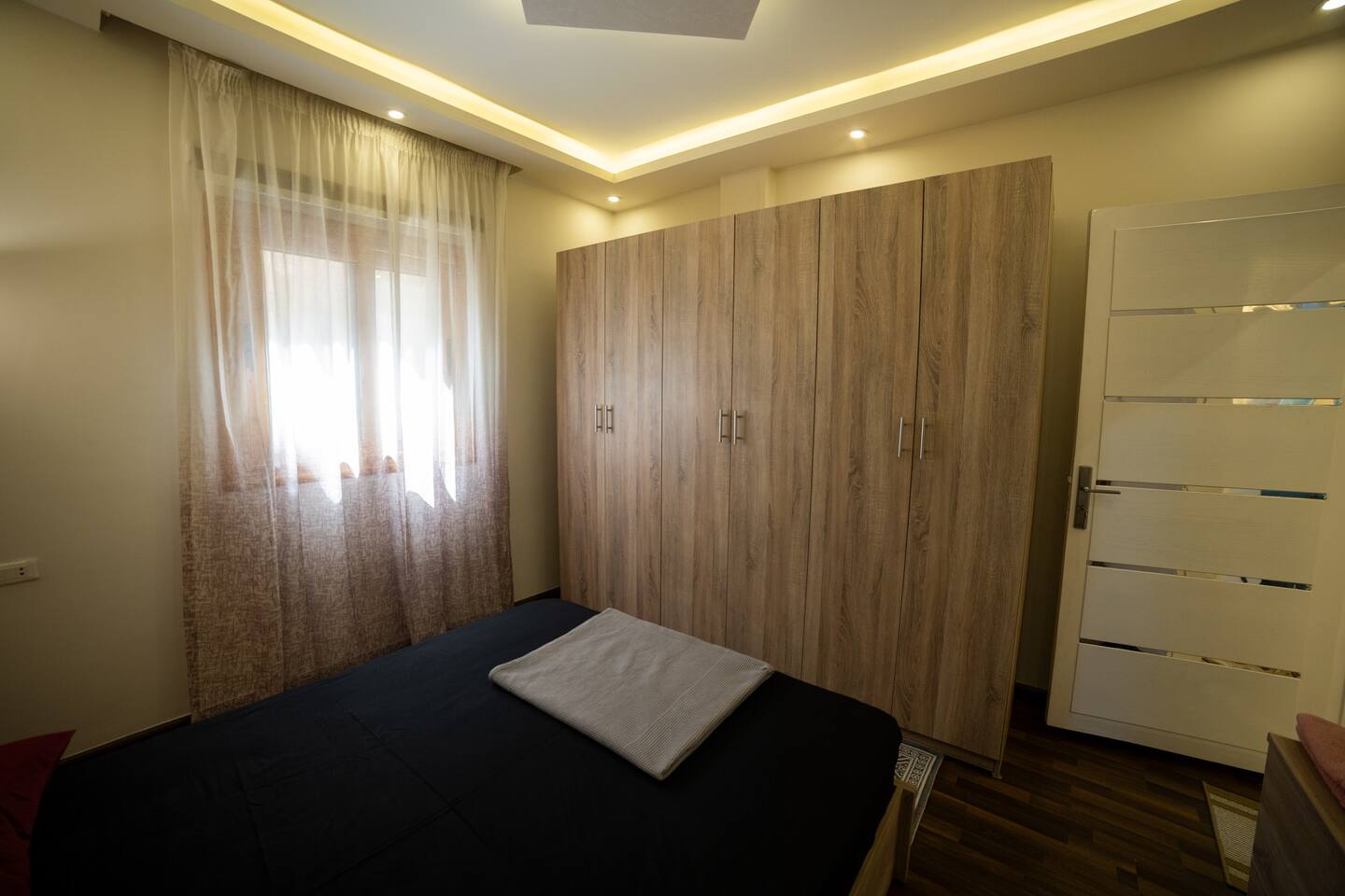 This two-bedroom apartment was recently remodeled to bring you all the modern comforts while traveling in an ancient city. Each bedroom can sleep up to two people: one with two twin beds and another master suite with a queen-sized bed. Each bedroom also comes equipped with a vanity/desk, wardrobe to hang your clothing, and powerful air conditioning to keep cool during hot Egyptian summers. Enjoy comforting fixtures in the bathroom, such as the dramatic marble from the local quarry and large rain showerhead. A full-length mirror in the hall will help you make sure you're looking your best everyday! The living room boasts a large sectional and flatscreen TV. A door leads to a generously-sized terrace balcony overlooking a serene street. It's perfect for hosting and entertaining. To accommodate even more guests, the couch can act as a sofa bed! Host up to six people in total. A full kitchen with bar seating overlooks a dining area/breakfast nook. If you find yourself in the mood to cook, there is a stove, microwave, refrigerator and freezer, electric kettle, and other basic accouterments. It even has an in-unit laundry machine; pack light and throw your clothes in for a refreshing clean! You won't regret booking with us. It’s made for someone who wants a piece of mind or traveling in a small group.