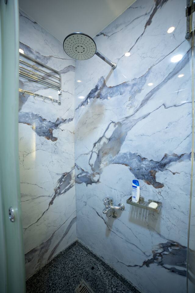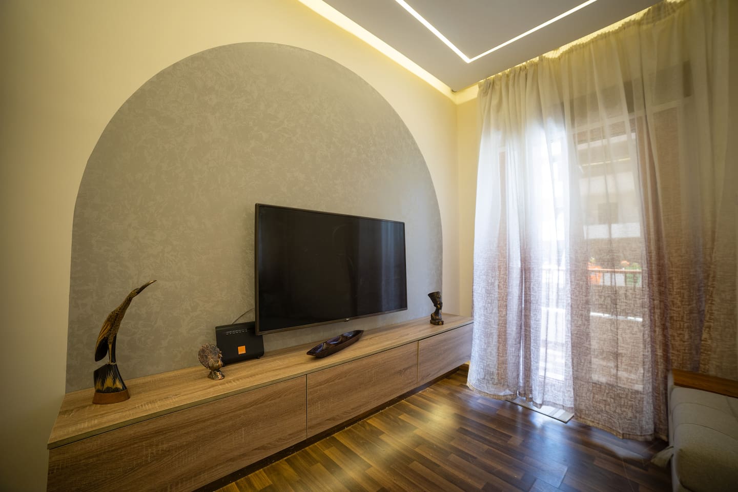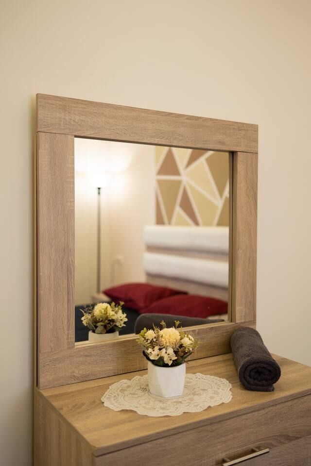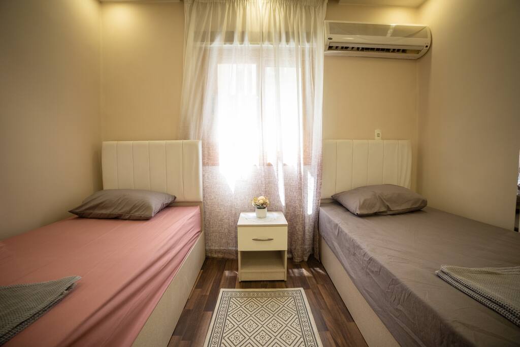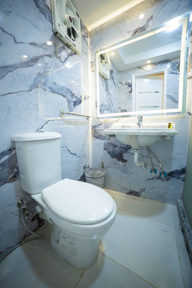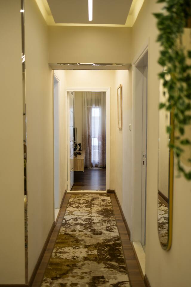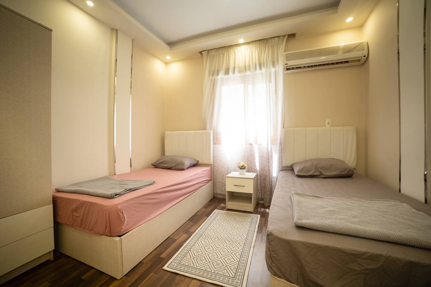 This two-bedroom apartment was recently remodeled to bring you all the modern comforts while traveling in an ancient city. Each bedroom can sleep up to two people: one with two twin beds and another master suite with a queen-sized bed. Each bedroom also comes equipped with a vanity/desk, wardrobe to hang your clothing, and powerful air conditioning to keep cool during hot Egyptian summers. Enjoy comforting fixtures in the bathroom, such as the dramatic marble from the local quarry and large rain showerhead. A full-length mirror in the hall will help you make sure you're looking your best everyday! The living room boasts a large sectional and flatscreen TV. A door leads to a generously-sized terrace balcony overlooking a serene street. It's perfect for hosting and entertaining. To accommodate even more guests, the couch can act as a sofa bed! Host up to six people in total. A full kitchen with bar seating overlooks a dining area/breakfast nook. If you find yourself in the mood to cook, there is a stove, microwave, refrigerator and freezer, electric kettle, and other basic accouterments. It even has an in-unit laundry machine; pack light and throw your clothes in for a refreshing clean! You won't regret booking with us. It’s made for someone who wants a piece of mind or traveling in a small group.