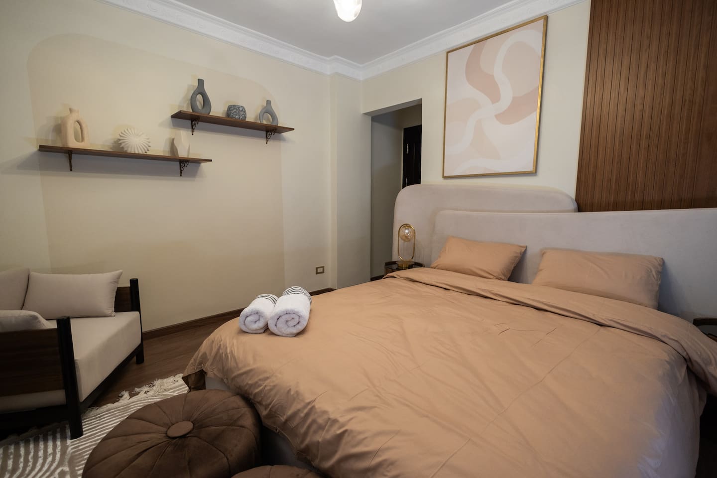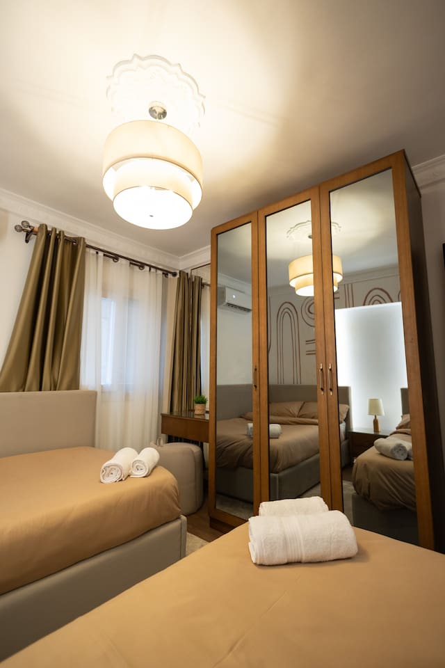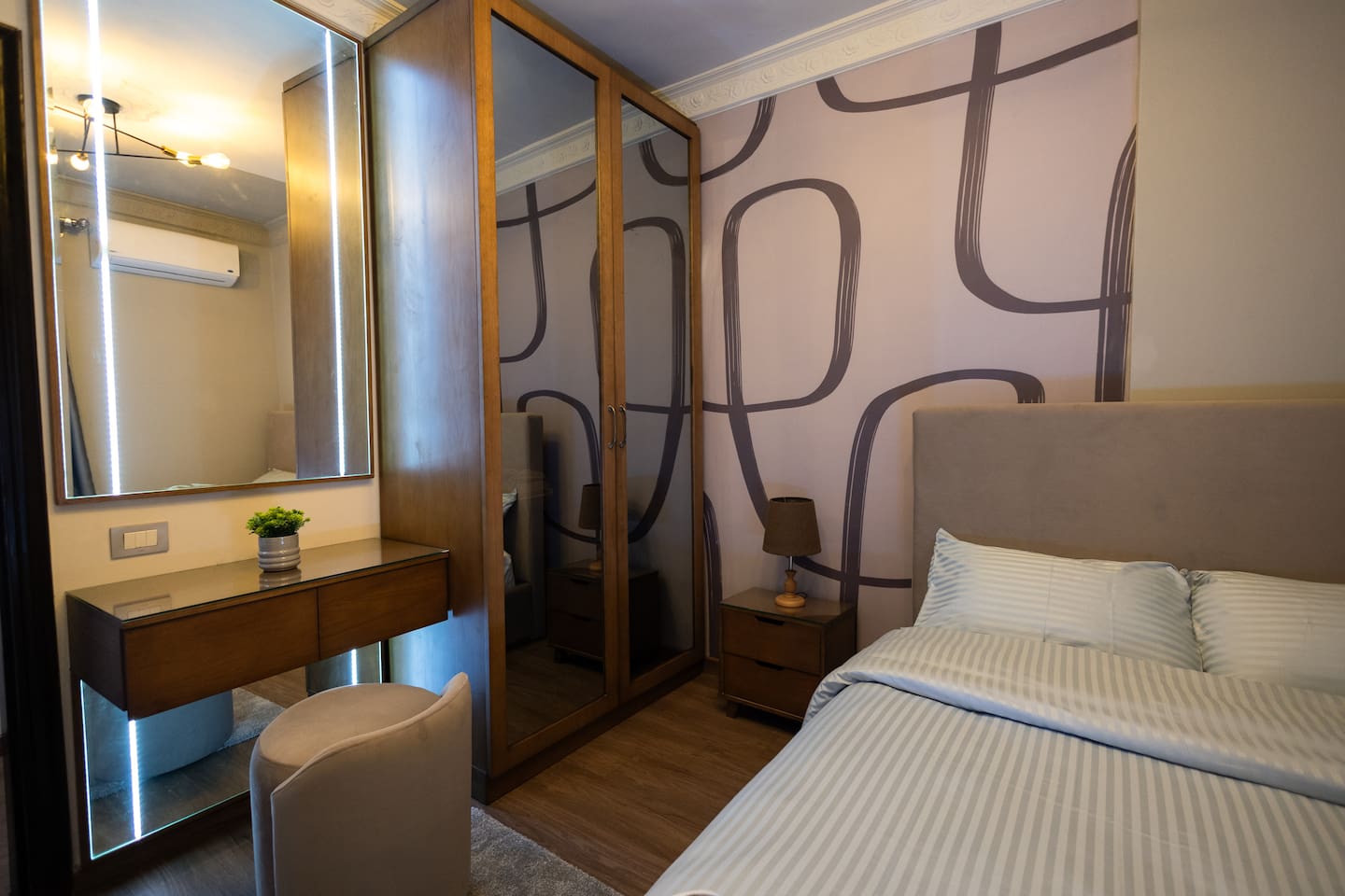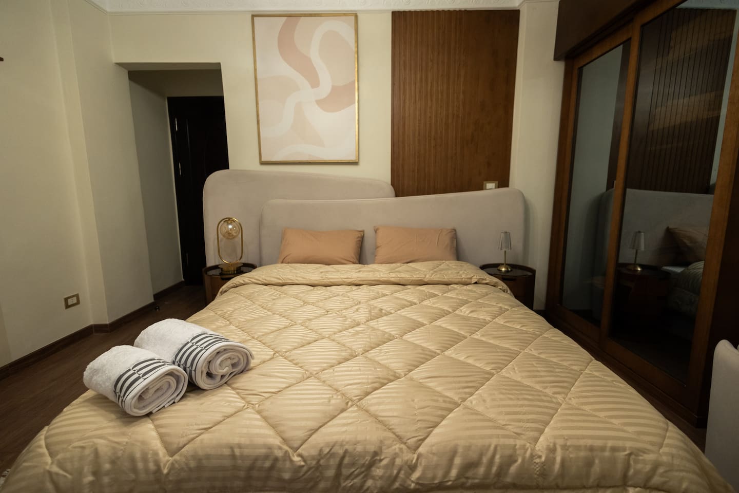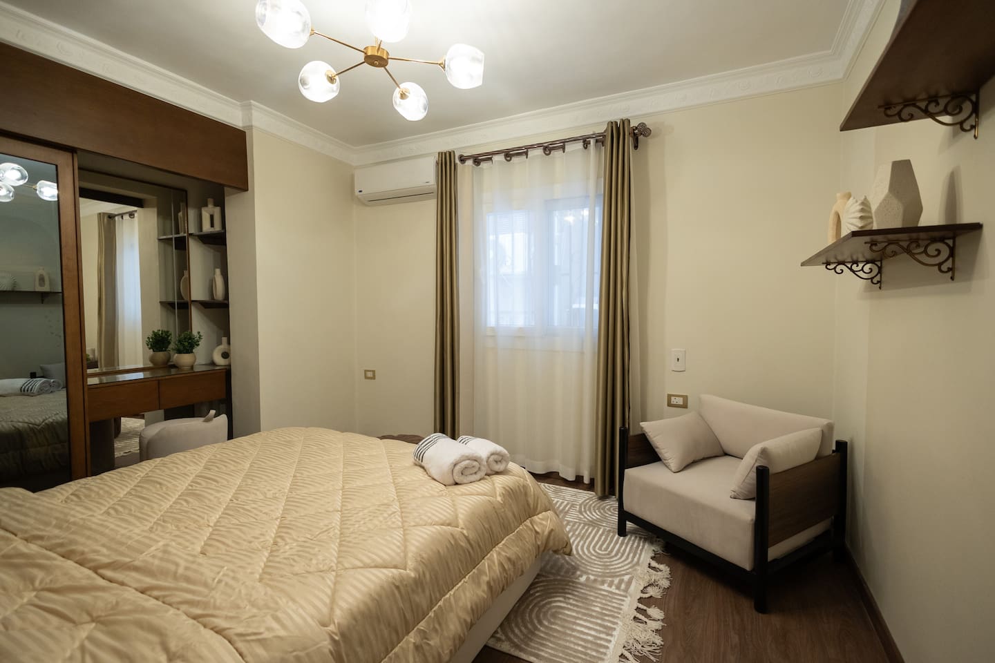 Experience upscale living in this beautifully renovated, luxurious 3-bedroom apartment in Cairo’s prestigious Heliopolis neighborhood. Perfectly designed to accommodate up to 7 guests, this elegant residence combines modern amenities with refined décor, offering an exclusive retreat for families, business travelers, or vacationers exploring Egypt’s rich history and vibrant city life. Apartment Features & Comfort: ->Elegant sleeping arrangements: One bedroom with two comfortable twin beds—ideal for children or friends—plus two spacious bedrooms with plush queen-sized beds, and finally a sofa in the living room. Each room is equipped with individual air conditioning units to keep you cool during Cairo’s warm days, alongside dedicated desks or vanity tables to help you prepare for your day in comfort and style. ->Tranquil ambiance: Set back from bustling streets, the apartment ensures a peaceful, quiet environment for restful sleep—perfect for light sleepers and families alike. ->Gourmet kitchen: Fully outfitted with premium appliances, including a coffee machine, electric kettle, microwave, and stove, making it easy to prepare meals and enjoy authentic home-cooked flavors. ->Modern bathrooms: Featuring rain showerheads, bidets, hair dryers, and a washing machine, the bathrooms offer luxury and convenience, whether you’re freshening up after a day of sightseeing or doing laundry during an extended stay. ->Inviting living space: Relax in the stylish living room, complete with a large TV and access to all major streaming platforms—ideal for unwinding with family or friends after a day exploring Cairo. ->Private balcony: Step outside to a charming balcony overlooking a quiet, tree-lined street—an inviting spot for morning coffee, evening relaxation, or simply soaking in the calm atmosphere of Heliopolis. ->Accessibility: Conveniently located on the first floor, the apartment requires a few stairs up, making it accessible for guests of all ages. Prime Location & Easy Transport: ->Close to Cairo International Airport: Just minutes away by car, making arrivals and departures smooth and hassle-free. ->Excellent connectivity: Taxis and ride-share options like Uber are easy to find, offering quick access to Cairo’s downtown, the Pyramids of Giza, the Egyptian Museum, and other world-famous landmarks. ->Nearby attractions: Explore the vibrant Korba district’s cafés and boutiques, visit the historic Baron Empain Palace, or enjoy shopping and entertainment at City Stars Mall—all just a short drive away. This upscale Heliopolis apartment offers the perfect blend of luxury, convenience, and family-friendly comfort. Whether you’re seeking a stylish base for business or a serene home-away-from-home to discover Cairo’s wonders, this apartment delivers an unforgettable stay in one of Egypt’s most desirable neighborhoods.