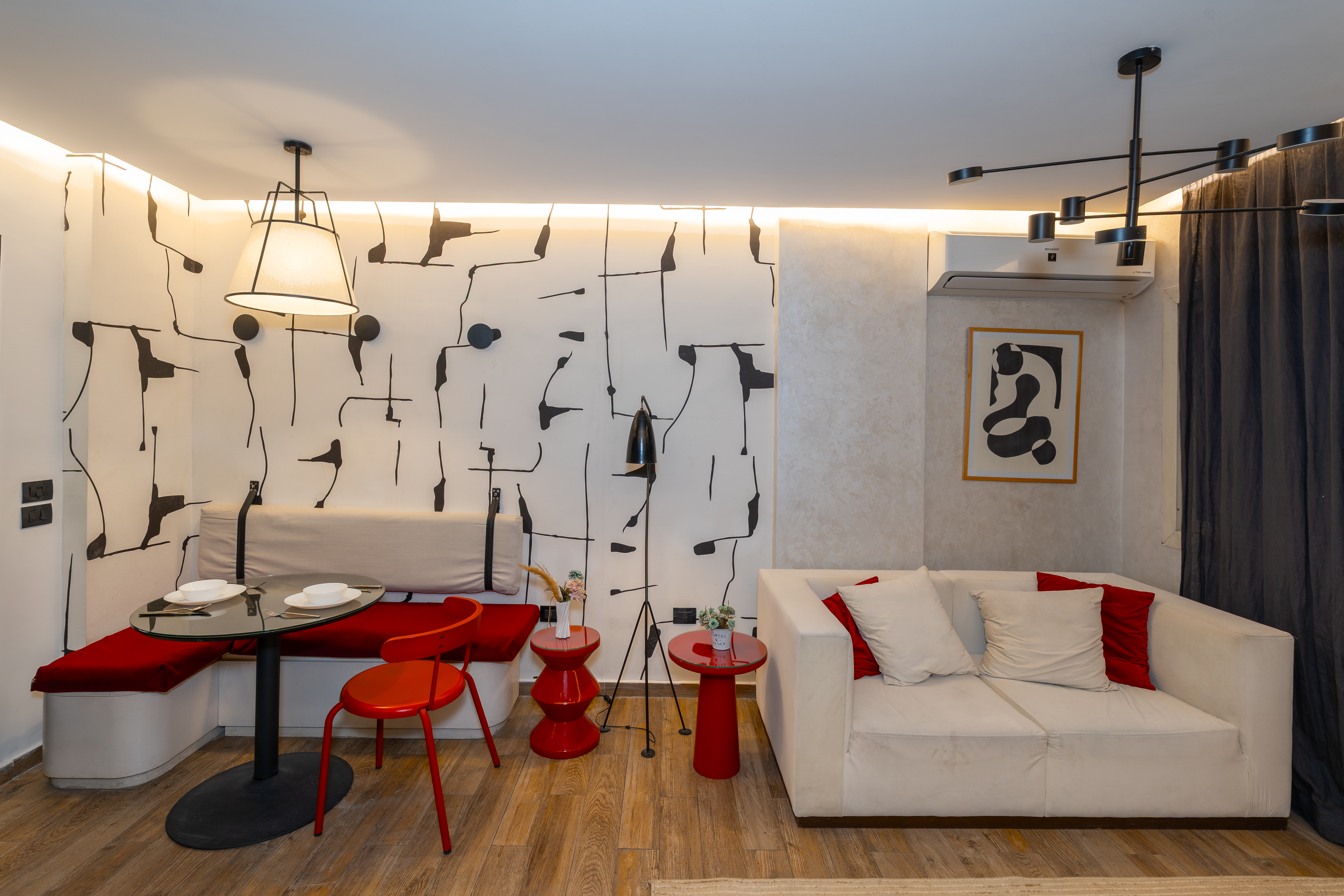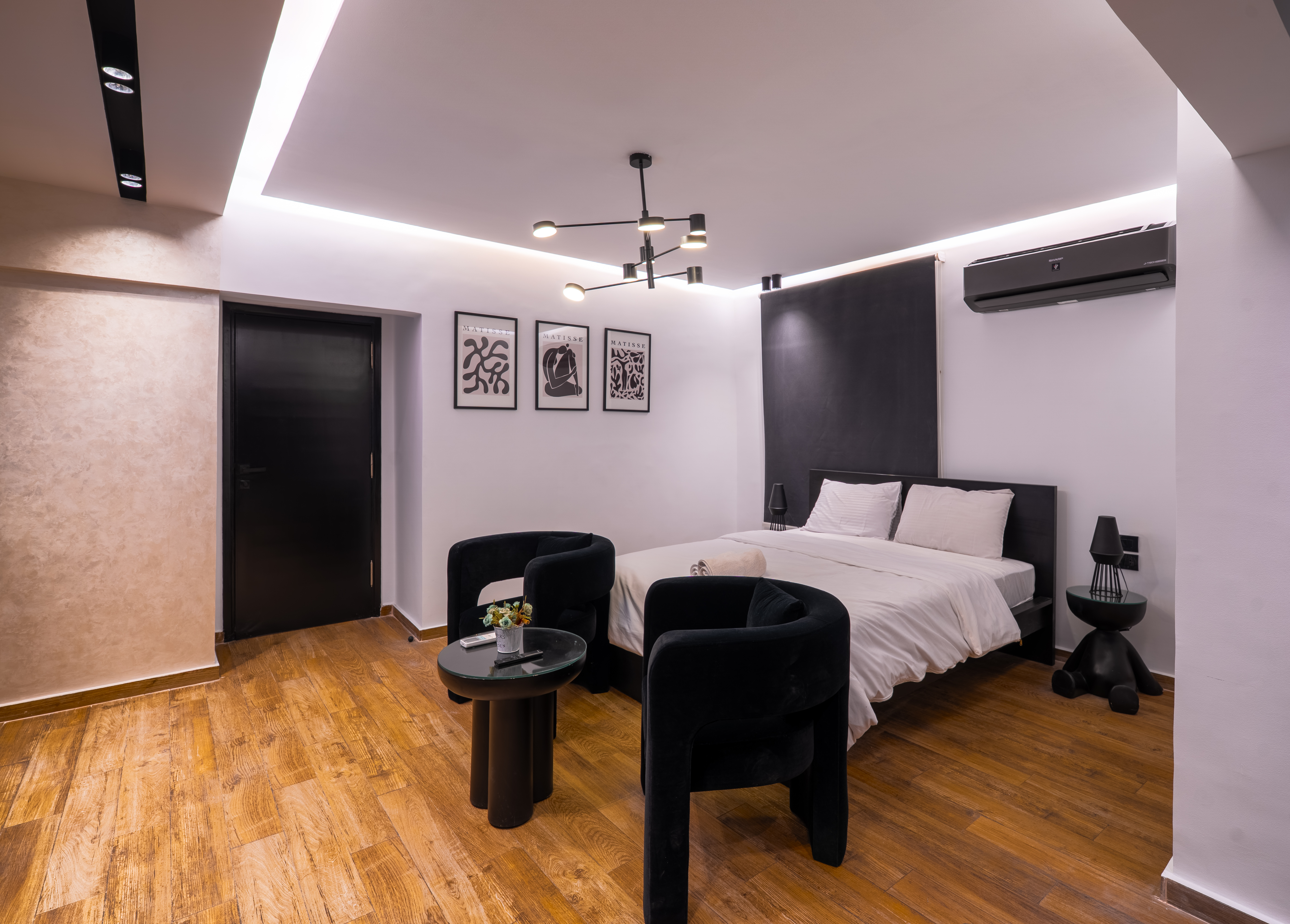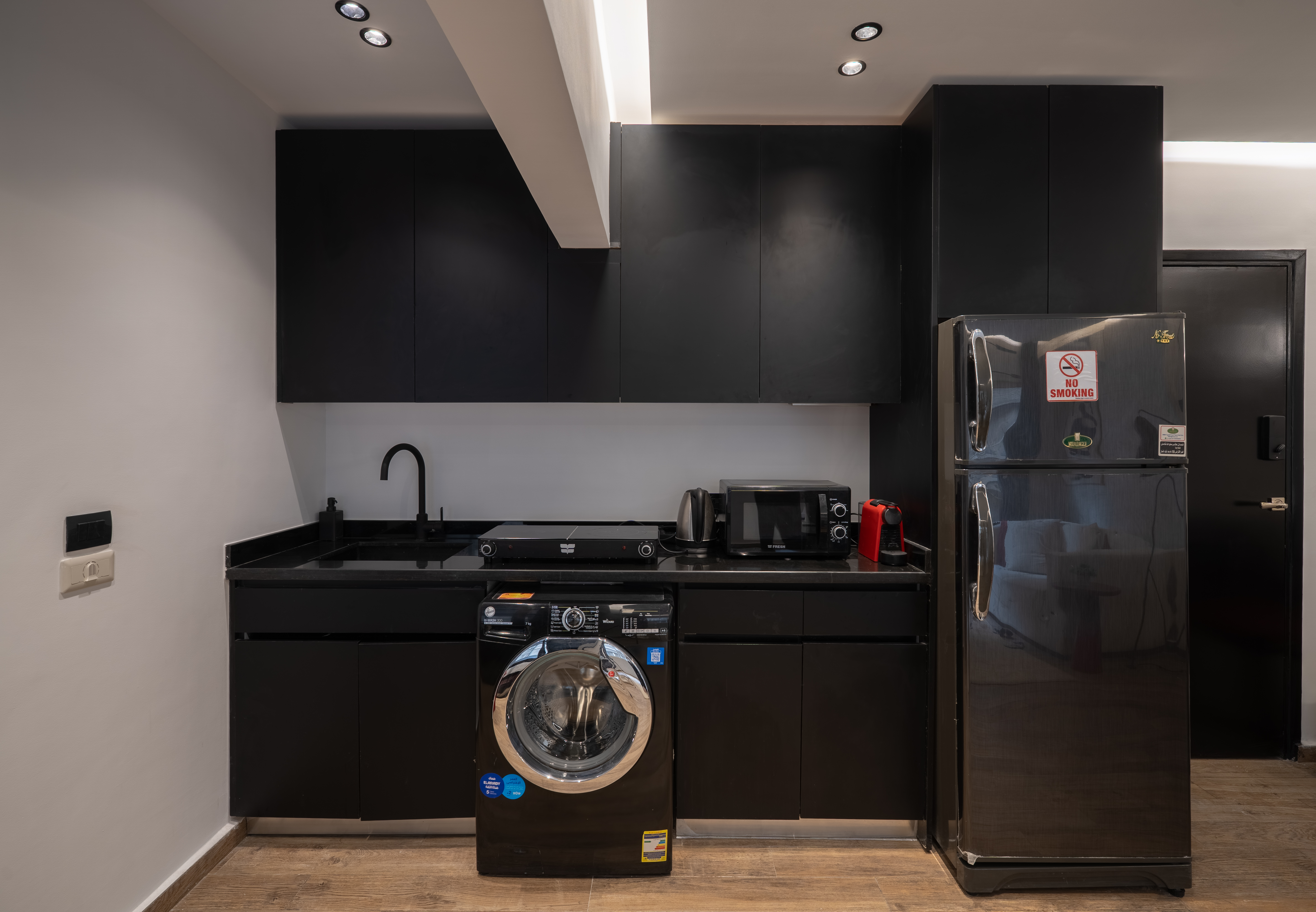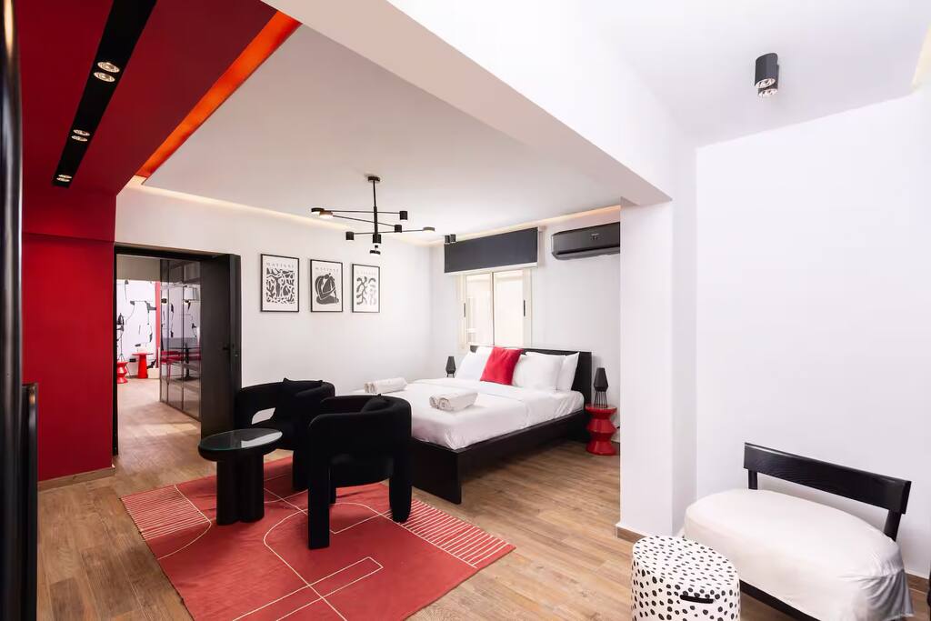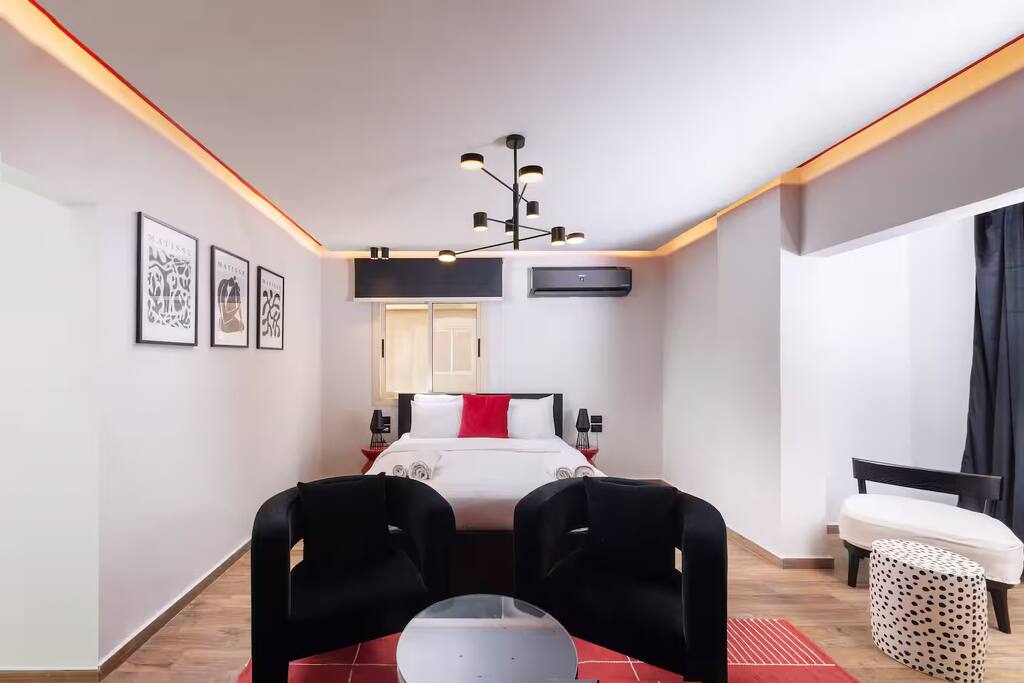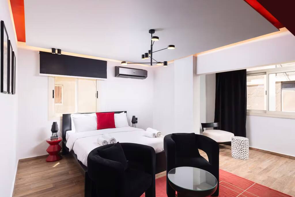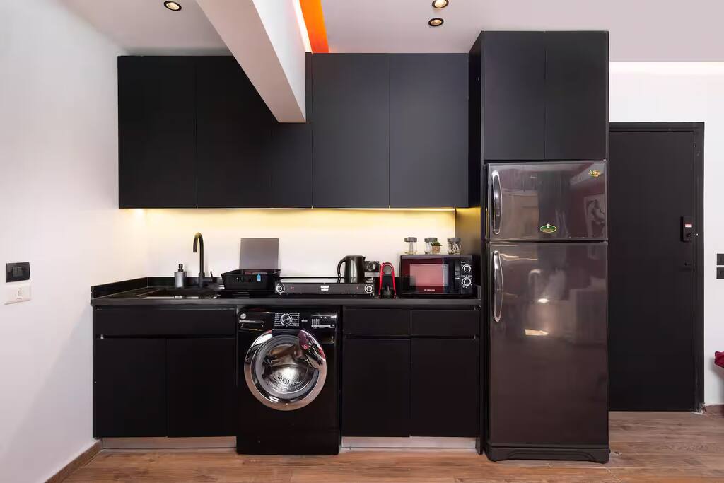 This stylish 2-bedroom apartment sleeps up to 4 guests, with queen-sized beds in each bedroom. Each sleeping area comes with an AC to keep you cool during sunny Egyptian days and a desk/vanity to get ready in the morning. Plus, this apartment is tucked away from any busy streets, guaranteeing a peaceful, quiet night’s sleep for even the lightest sleeper. It has everything you would want for either a quick business trip or extended stay. The kitchen is fully equipped with espresso machine, microwave, and washing machine. Enjoy a modernized bathroom that includes a rain showerhead, hair dryer, bidet, and chic vessel sink. Kick back in the living room to watch some TV with all the major streaming platforms. Enjoy a morning coffee in the dining nook. You’ll bookend your trip with easy commutes from the airport, just minutes away by car. Taxis and Ubers to main attractions downtown are easy to catch downstairs, where a 24-hour security in the building will be available for you.