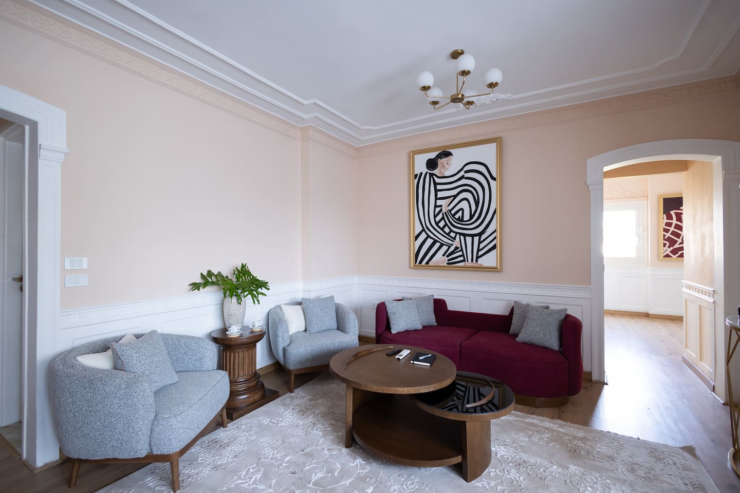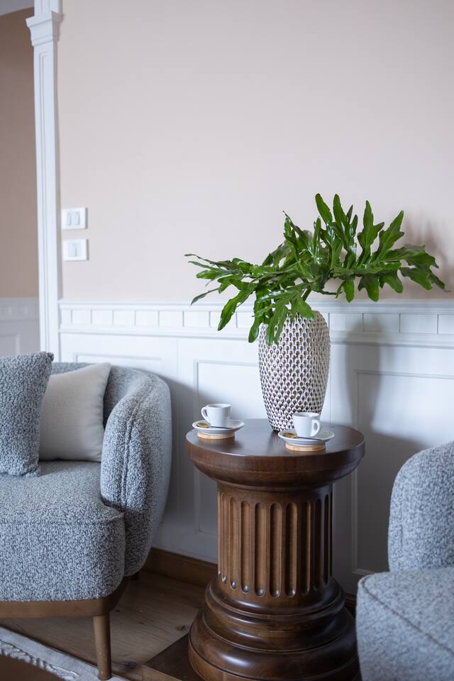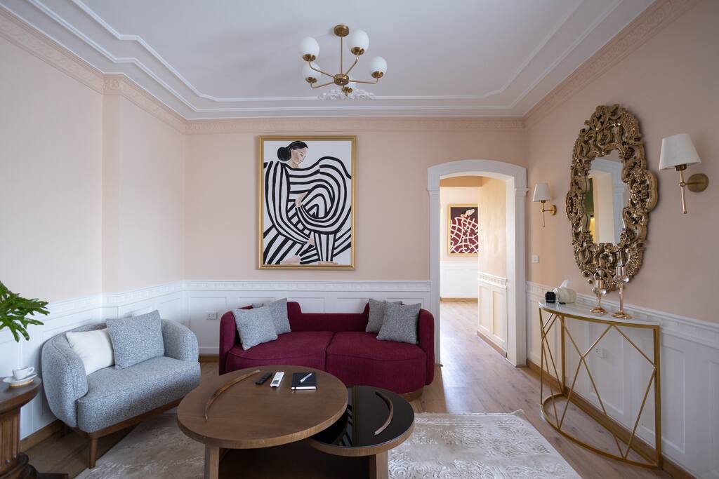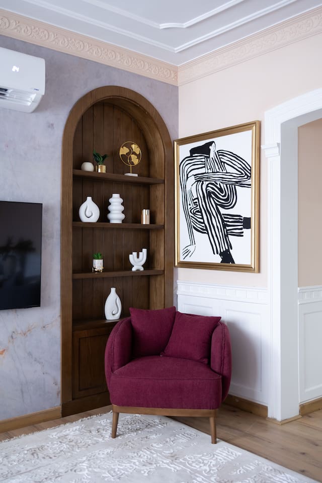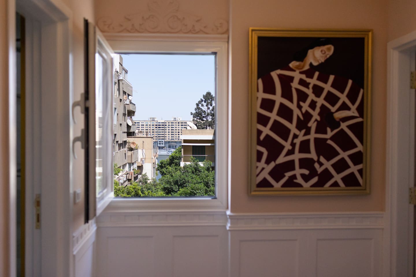 Experience modern elegance and timeless charm in this artfully restored Cairo apartment. Highlights include custom local artwork, peaceful bedrooms with private balconies, a fully equipped built in kitchen, and two stylish bathrooms. Just steps from 26th of July St, The Hilton, and the Nile, it’s the perfect retreat near award-winning restaurants, embassies, and transit. A charming hallway window offers a glimpse of the Nile, especially magical when it lights up at night.