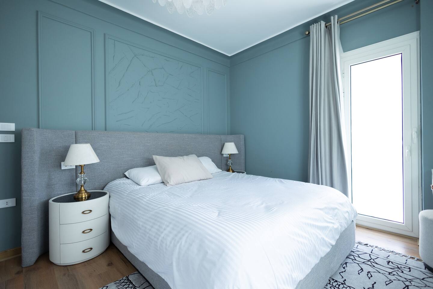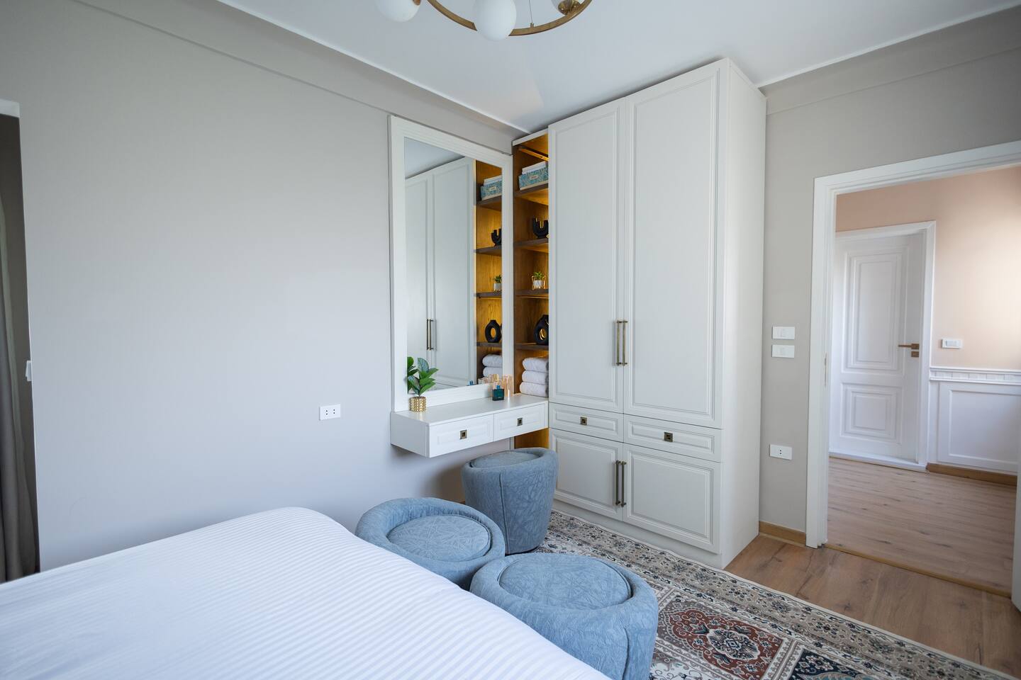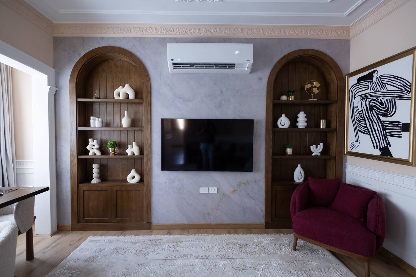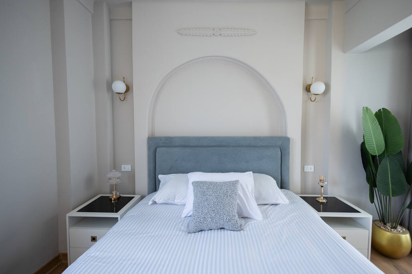 Experience modern elegance and timeless charm in this artfully restored Cairo apartment. Highlights include custom local artwork, peaceful bedrooms with private balconies, a fully equipped built in kitchen, and two stylish bathrooms. Just steps from 26th of July St, The Hilton, and the Nile, it’s the perfect retreat near award-winning restaurants, embassies, and transit. A charming hallway window offers a glimpse of the Nile, especially magical when it lights up at night.
