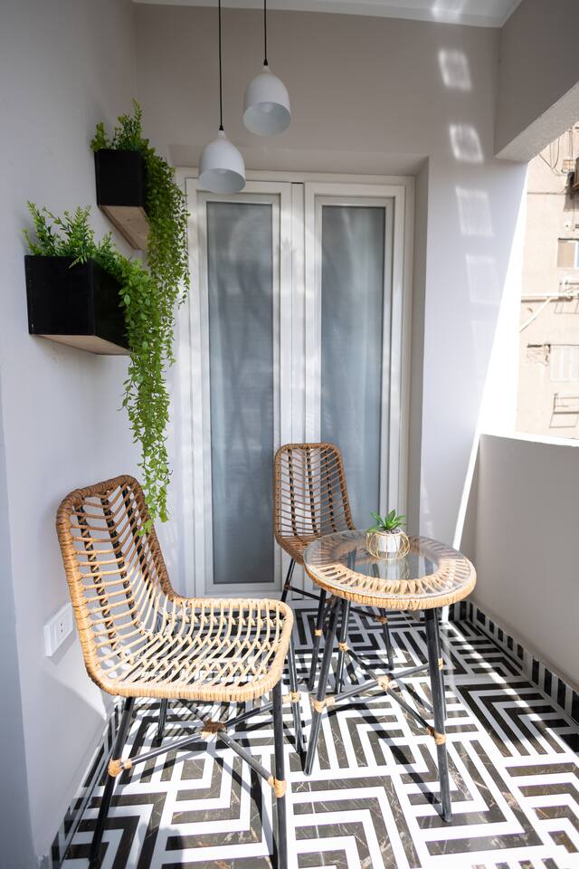 Welcome to your serene oasis in the heart of Cairo! This recently renovated apartment seamlessly blends old-world charm with modern comforts, featuring custom furniture and original artwork commissioned from local artists. You'll be located just above the famous Zawal boutique shop. Both bedrooms are tucked away from the bustling street, ensuring a restful night’s sleep. Each room includes a plush queen-sized bed, spacious wardrobe, elegant vanity, and access to a private balcony. The apartment offers two bathrooms—one for guests and one main bath with a powerful shower and brand-new washer for your convenience. The fully equipped kitchen boasts new, high-performing appliances including a stove, oven, microwave, kettle, coffee maker, and refrigerator—perfect for preparing meals to enjoy in the dining room, which comfortably seats six. A charming hallway window offers a glimpse of the Nile, especially magical when it lights up at night. Step outside and find yourself just moments from the chic 26th of July Street, international embassies, riverside restaurants, and the Safaa Hegazy Metro stop—making this the perfect base to explore the best of Cairo. Taxis and Ubers to main attractions downtown are easy to catch downstairs, where a 24-hour security in the building will be available for you. - Powerful AC/Heating throughout to stay cool during hot summer days in Cairo and warm up in the winter! - The apartment is on the seventh floor of a building with multiple elevators to take you up and down. Please take the top elevator.